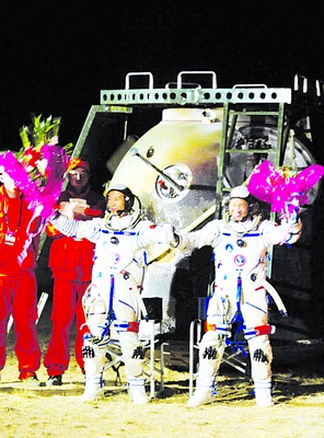 10月17日4时33分,神舟六号返回舱在内蒙古四子王旗中部草原成功着陆,航天员费俊龙、聂海胜平安返回。新华社记者赵建伟摄
